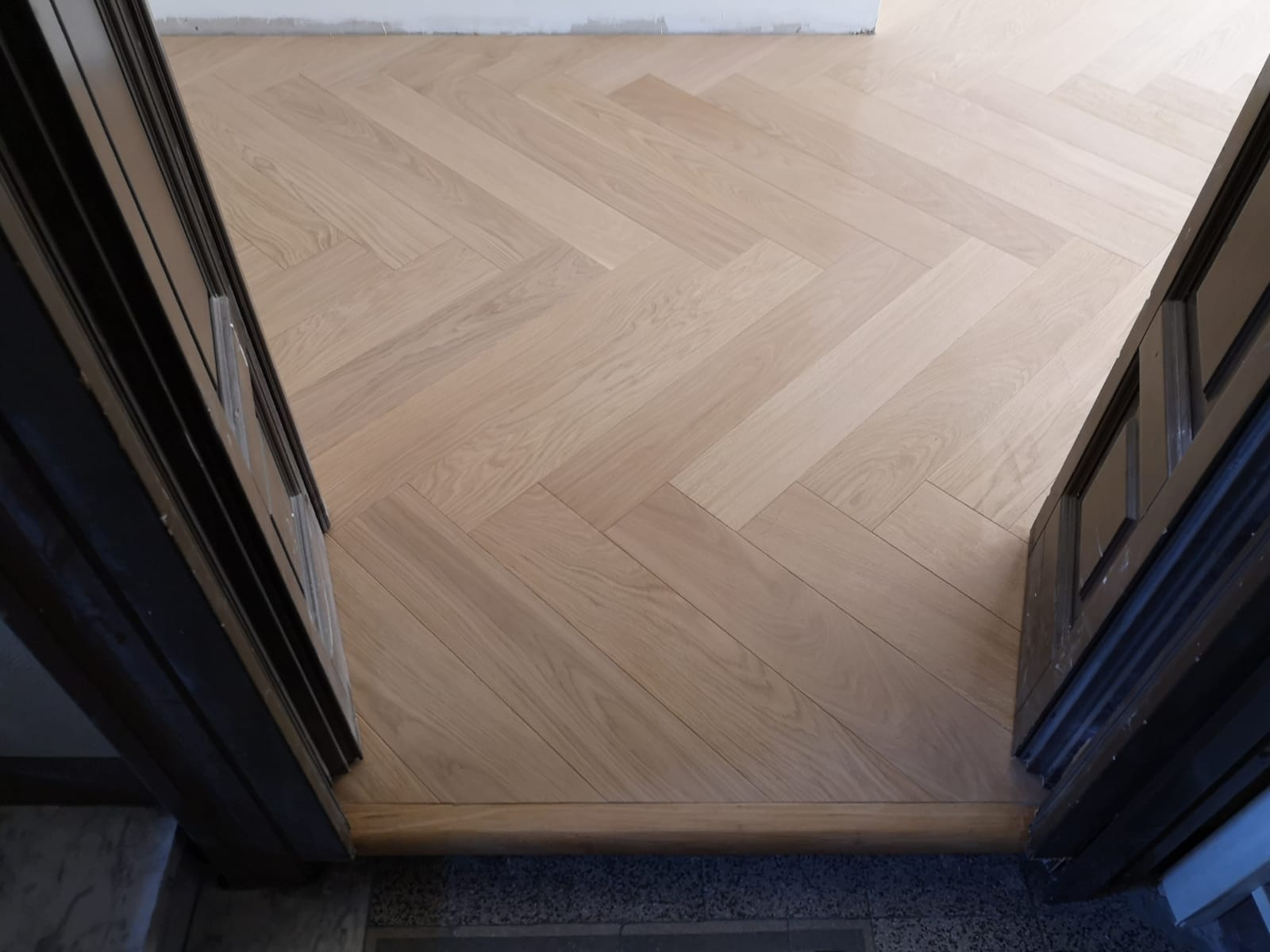 Nelle immagini di questa pagina del portale Parquettisti d'Italia mostriamo l'operato di un artigiano del parquet di nome Alessandro che opera ad Ancona e provincia e si è dedicato al montaggio di un parquet in legno prefinito ma che si poteva fare anche con legno massello grezzo di rovere in formato a spina italiana con listoncini rettangolari montati a pavimento a 90° con file contrapposte a formare un disegno geometrico regolare e molto elegante. Le operazioni di prefinitura avrebbero poi visto l'uso di macchinari per la pulitura e levigatura della superficie prima di procedere con la finitura di tre mani di vernice ad effetto semi opaco dal colore naturale.