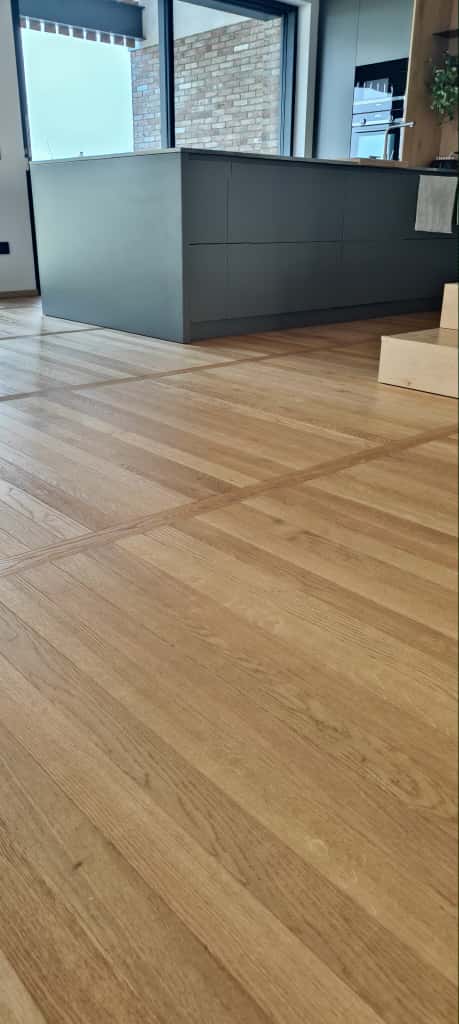 Ferruccio è un Signore del Parquet: come poterlo definire diversamente dopo tanti anni spesi a lavorare con attenzione e qualità nel mondo della posa e levigatura dei pavimenti in legno. Non solo: Ferruccio è uno specialista a 360 gradi che si occupa anche di laminature e ripristini di pavimenti in legno rovinati, ma anche di montaggio e posa di succedanei del legno quali i laminati e parquet in PVC e PSC ad effetto legno. In questo caso condivide con noi fotografie di un lavoro molto complesso, risultato di una posa certosina di plancette di parquet prefinito in legno di rovere con finitura opaca naturale color miele, con disegno a binario, o posa parallela, interrotte da file ortogonali di medesimo legno disposte ad attraversare lo schema principale.