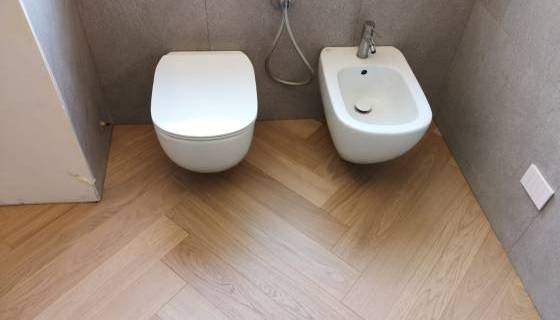 Nelle immagini di questa pagina del portale Parquettisti d'Italia mostriamo l'operato di un artigiano del parquet di nome Alessandro che opera ad Ancona e provincia e si è dedicato al montaggio di un parquet in legno prefinito ma che si poteva fare anche con legno massello grezzo di rovere in formato a spina italiana con listoncini rettangolari montati a pavimento a 90° con file contrapposte a formare un disegno geometrico regolare e molto elegante. Le operazioni di prefinitura avrebbero poi visto l'uso di macchinari per la pulitura e levigatura della superficie prima di procedere con la finitura di tre mani di vernice ad effetto semi opaco dal colore naturale.