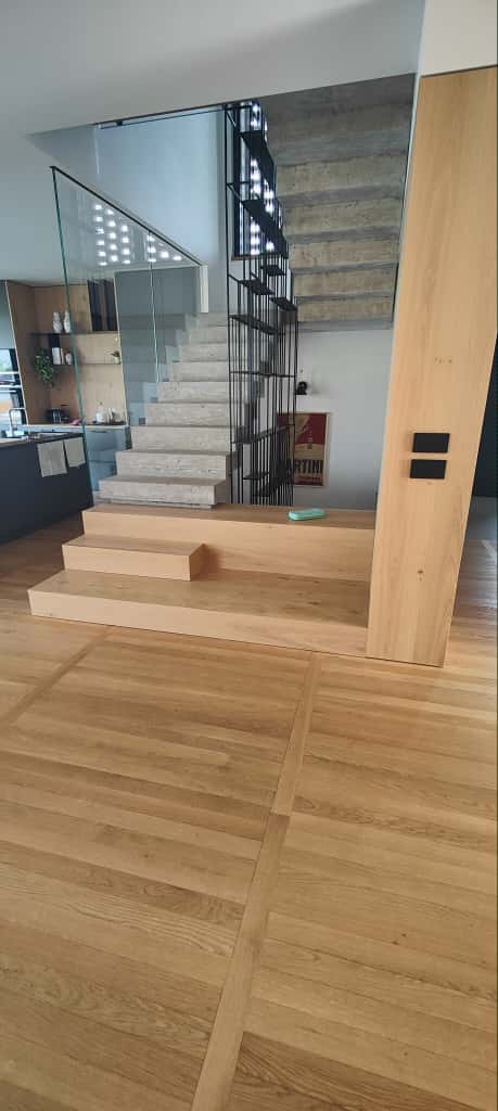 Ferruccio è un Signore del Parquet: come poterlo definire diversamente dopo tanti anni spesi a lavorare con attenzione e qualità nel mondo della posa e levigatura dei pavimenti in legno. Non solo: Ferruccio è uno specialista a 360 gradi che si occupa anche di laminature e ripristini di pavimenti in legno rovinati, ma anche di montaggio e posa di succedanei del legno quali i laminati e parquet in PVC e PSC ad effetto legno. In questo caso condivide con noi fotografie di un lavoro molto complesso, risultato di una posa certosina di plancette di parquet prefinito in legno di rovere con finitura opaca naturale color miele, con disegno a binario, o posa parallela, interrotte da file ortogonali di medesimo legno disposte ad attraversare lo schema principale.